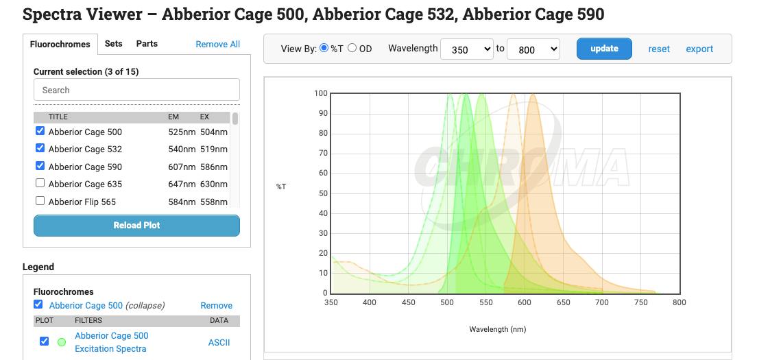 Use this Spectra Viewer Tool to add fluorochromes, filters sets and individual filters plot wavelength (nm) and %T. Click Here to Use the Spectra Viewer Tool